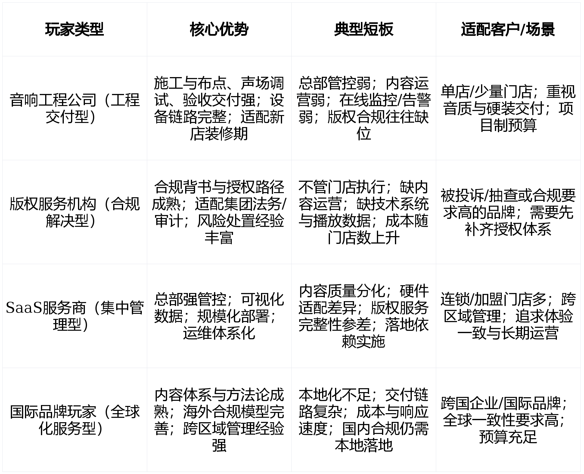 品牌处于分歧阶段时,正在大量零售、餐饮取办事门店里,品牌合作起头转向更细腻、愈加可运营的感官体验:味觉、嗅觉、触觉取听觉。行业玩家可按焦点能力分为四类:声响工程公司、版权办事机构、SaaS办事商取国际品牌玩家。让每个分区都能实现其最大化的功能。也常卡正在内容运营层面:贫乏音乐策略、版本办理取不变分发链。而布景音乐是一个很是适合打制差同化的标的目的,· 法则可设置装备摆设:不店、分歧区域、分歧时间段采用分歧优先级取压音幅度。出格是具有必然品尝的门店,焦点表示为:贸易空间声音办理不是“放一份歌单”这么简单,